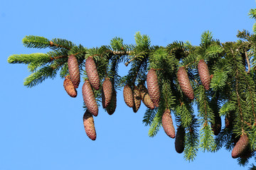 Picea omorika. Serbian spruce tree in the garden. Close up.