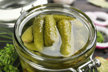 Homemade marinated or pickled cucumbers with dill, garlic and spices in big glass jar on rustic brown table, selective focus