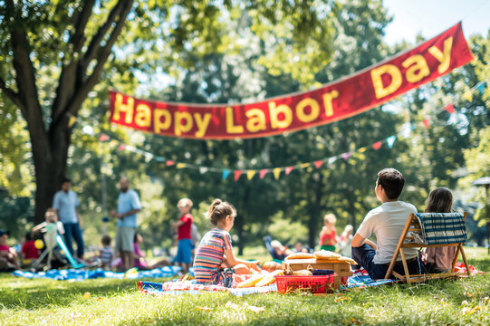 Families are enjoying a labor day picnic in the park, celebrating with food and community