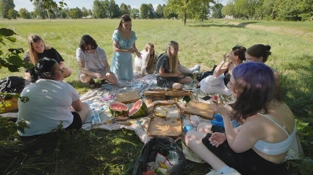 A diverse group of five friends is enjoying a picnic in a park, sitting on a blanket with food and drinks. They are chatting, sharing meals, and having a relaxed outdoor gathering together.