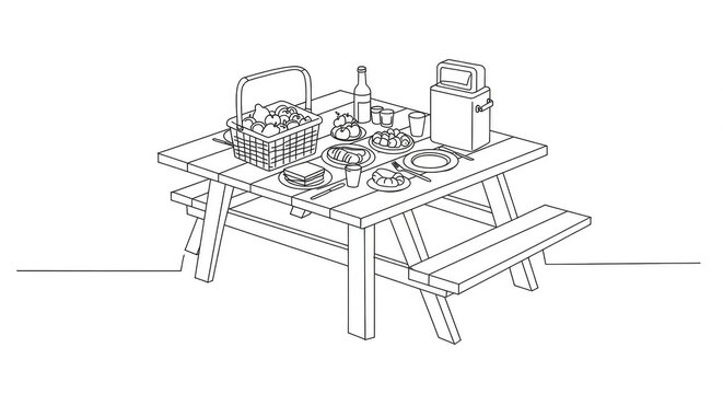 Delicious road trip snacks on picnic table by lakeside, summer getaway