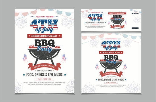 Set of square banner and stories for instagram and facebook, a4 poster for independence day barbecue party, vector illustration eps 10