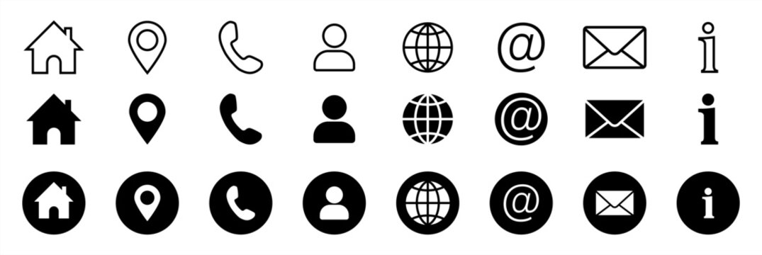 Business icon for company connection set in different style. Name, phone, mobile, place, location, mail, website and message card sign. Contact symbol design template. Vector 10 eps.