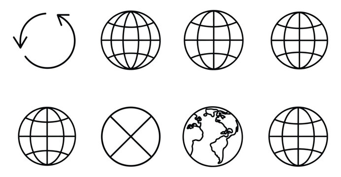 Illustration of globes and rotation symbol, representing global connectivity, worldwide communication, and geographical concepts with grid lines and continental outlines