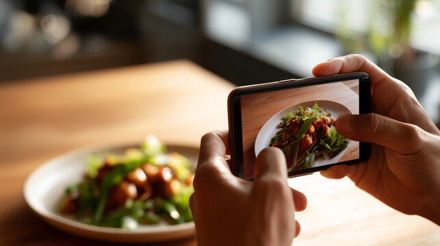 realistic cinematic scene of woman taking a picture of gourmet Thai food with smartphone, detailed reflections on phone screen, natural window light illuminating the dish, cozy woo