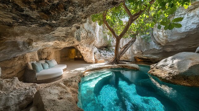 A serene and pictures natural rock pool nestled within a rugged limestone cave