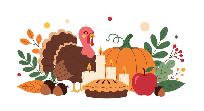 A festive thanksgiving scene featuring a happy turkey pumpkin pie autumn leaves and candles for a joyful celebration