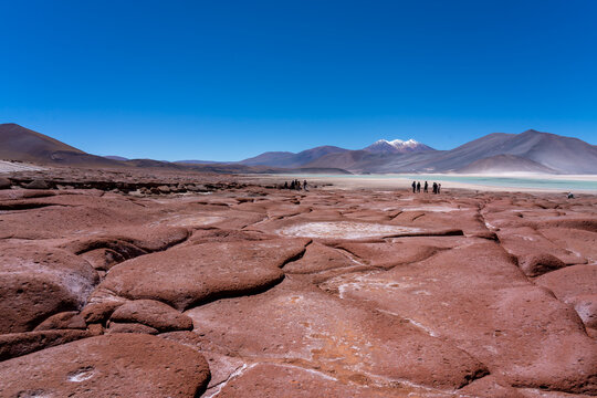 Red Rocks (Piedras Rojas), lagoon and salt flats with unrecognizable tourists in Atacama Desert, Chile. These volcanic landscapes are situated in the heart of the Chilean altiplano.