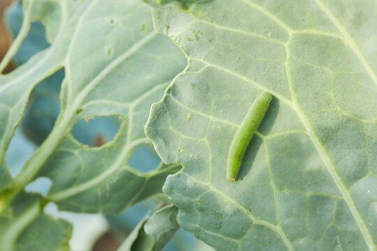 Cabbage white butterfly larva feeding on kale leaf. Cabbage butterfly or Pieris rapae. Macro of small 9 day old green caterpillar making a hole in brassica leaf and a tiny green poop. Selective focus.