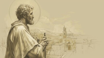 Biblical Illustration of Saint Mark the Evangelist in deep prayer, holding a cross, serene church setting, piety and dedication, beige background, copyspace