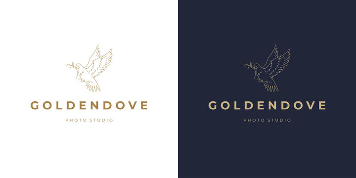 Flying pigeon with tree branch logo emblem design template vector illustration in minimal line art style