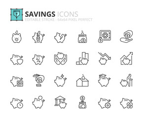 Simple set of outline icons about savings. Financial concept.