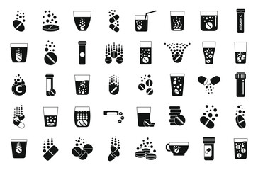 Effervescent tablets icons set simple vector. Water pill. Cup drug aspiring