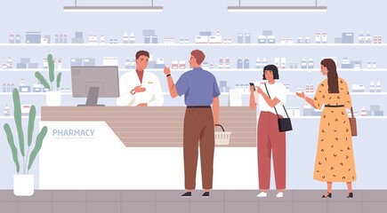 Recipe bottle with potion, pills, capsules and tablets. Prescription for medicines and jars and blisters with pills. Medicine and pharmacology. For magazines, websites and apps. Flat illustration