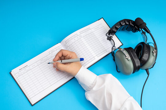 Close up of an airplane pilot hand filling in an flight log with