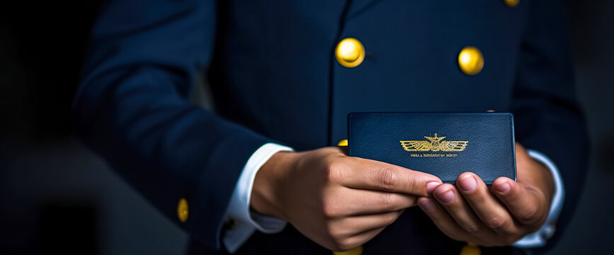 A pilot in uniform and a pilot's license in close-up. Man holding pilot's license, man with ID card, identity card