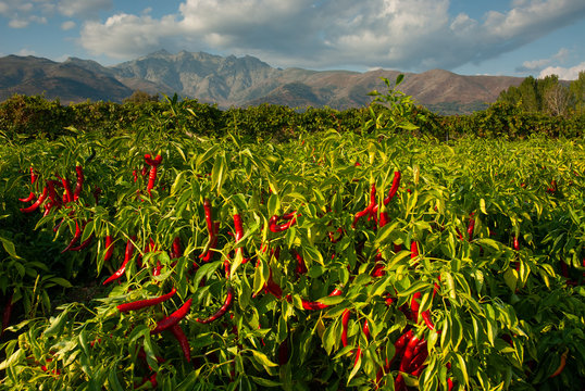 Cultivo de pimiento en la comarca extremeña de La Vera, con la sierra de Gredos al fondo.