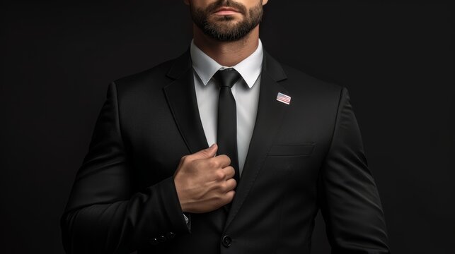 A man in a black suit, white shirt, and an American flag pin on his lapel against a black background