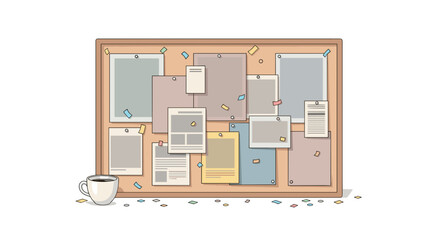Office cork bulletin board template for business. With sheets of paper and stickers for notes. Mockup isolated on a transparent background. Vector illustration