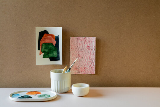 Cozy home workspace at night with glowing laptop and warm lamp creating focused mood. coffee cup sits on wooden desk near notebook and pinboard in background