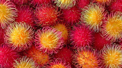 Close-up of colorful pincushion protea flowers with yellow centers and pink to orange spiky petals. Concept Close-up Protea Macro, Pincushion Protea Flowers, Colorful Floral Details, Yellow Centers