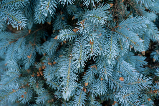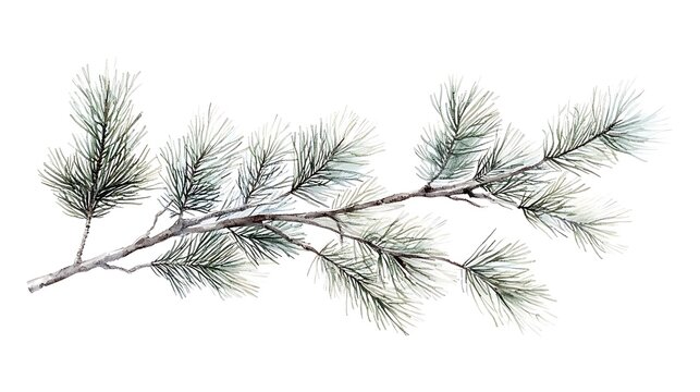 Close-up of a green pine branch with needles on a white background.  PNG transparent.