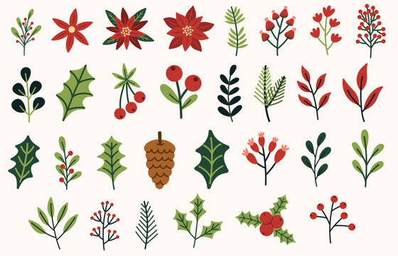 Christmas florals and foliage elements set. Holly, winterberries, eucalyptus, pine cone, mistletoe, poinsettia. Buildable decorative and festive floral arrangement. Hand drawn vector illustrations.
