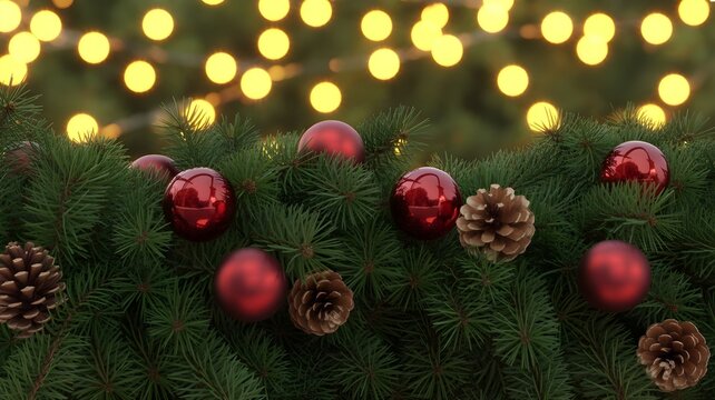 A wrapped gift, adorned with ribbon, sits among pine cones and ornaments against a blurred, festive, lit backdrop