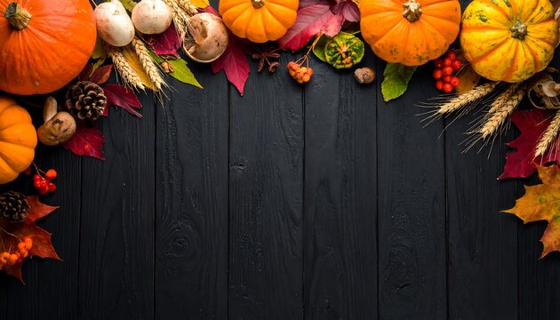 Autumn Harvest Bounty - Pumpkins, Leaves, and Rustic Wood Background.