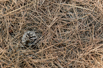 Pine cones on the ground under a bunch of dried pine needles in Benissanet; Catalonia, Tarragona, Spain
