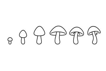 Mushroom Growth Icons. Line style icons of Mushroom Growth Stages: pinhead mushroom, small bud growth, half-open cap, fully