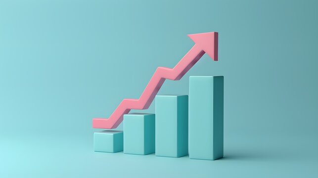 3D bar chart with pink arrow in pastel colors symbolizing growth and progress on blue background.