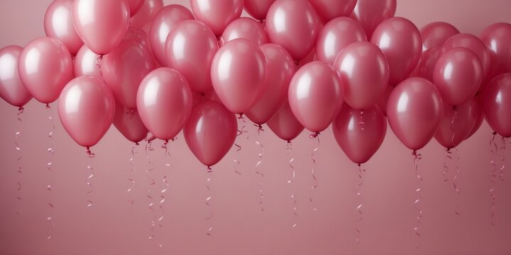 Young brunette woman holding pink balloons screaming proud, celebrating victory and success very excited with raised arms