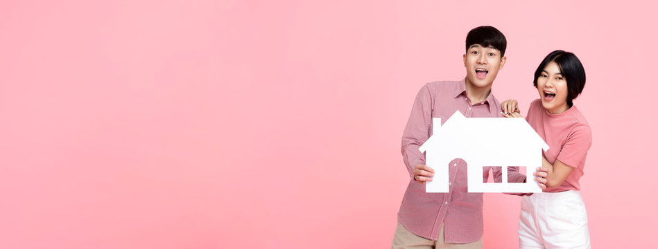 Easter pastel pink banner background, white fluffy bunny rabbit ears, speckled decorative eggs border, cute holiday greeting card template, copy space.