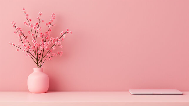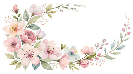 Delicate floral arrangement with pink blossoms in watercolor style, botanical design, copy space