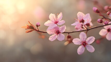 Delicate pink blossoms on a tree branch glow with warm sunlight in a soft focus setting