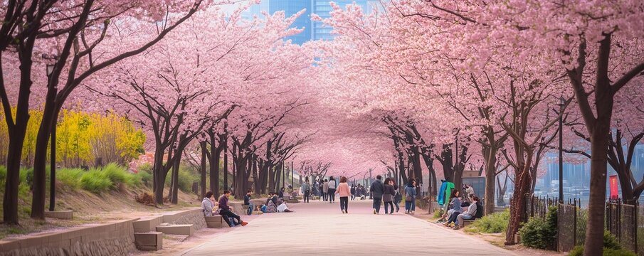 The beautiful cherry blossoms lining the paths of Yeouido Park in Seoul, with couples and families enjoying picnics under the pink blossoms