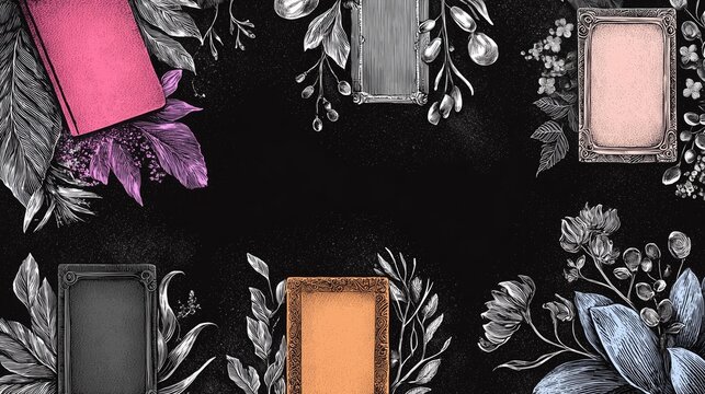 Decorative vintage illustration with colorful frames, floral leaves, and a pink book on black background, suitable for art, design, and elegant decor concepts.