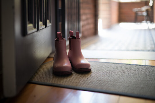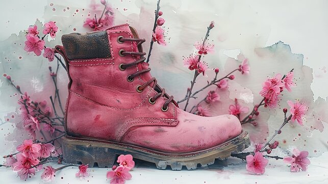 against a light blue background, a pair of pink boots are the focal point, serving as a unique vase for a variety of flowers