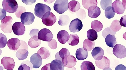 A vibrant watercolor pattern of scattered purple and pink circles on a white background.