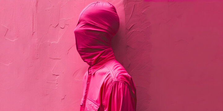 A woman wearing a pink headscarf and pink clothing, looking at the camera. Generative AI