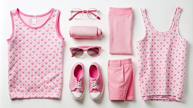 Retro-inspired pink clothing and accessories, including tank tops, sunglasses, and chunky shoes, arranged in a seamless repeating pattern on a crisp white background.