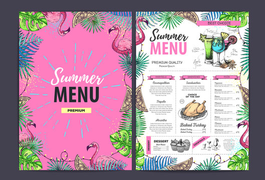 Restaurant summer menu design with tropic leaves and cocktails. Fast food menu