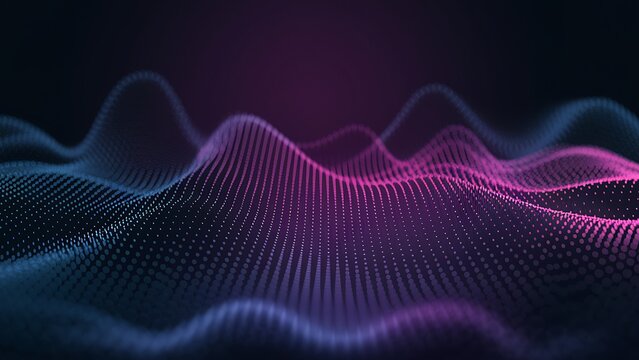 Abstract waves of light blue and pink dots creating a digital landscape with a dark background