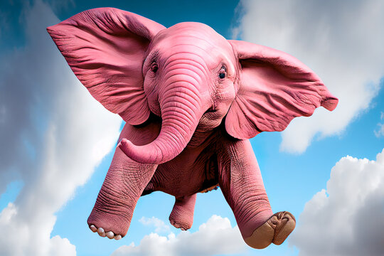 Funny animal concept, pink elephant flying in the sky with thick white clouds. Elephant in the sky. Illustration, Generative AI.