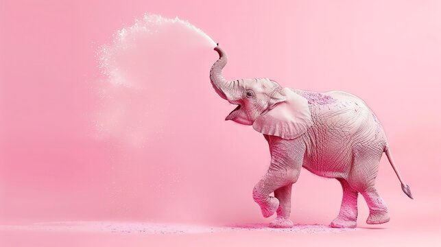 A whimsical illustration of a pink elephant standing in front of a pink background.