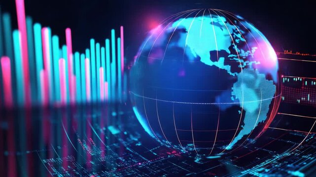 glowing holographic pink globe of earth floating in futuristic digital space with red lights
