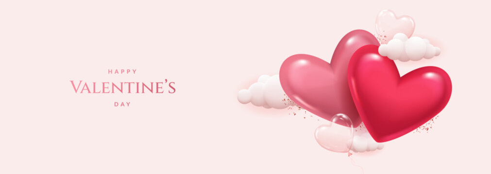 Valentine's Day or wedding day romantic pink background with pink hearts, clouds and balloons. Holiday banner.