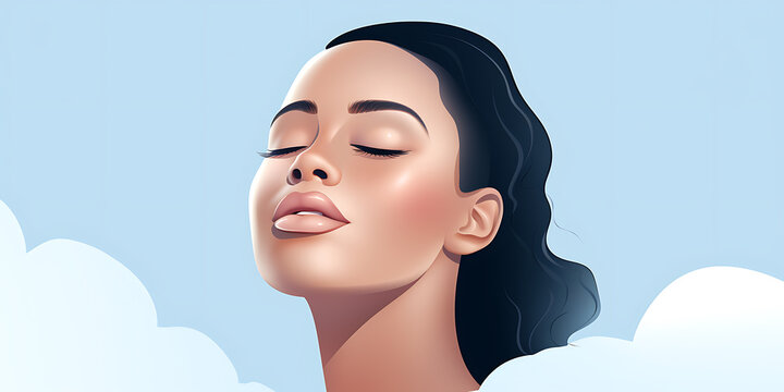 A serene woman with black hair, blue eyes, and pink lips against a blue and white background evokes peace and tranquility.