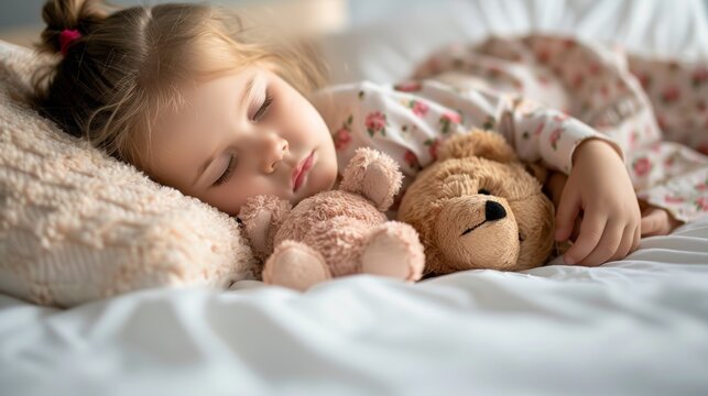 Sweet baby girl napping in bed with teddy animal. Babies sleeping on white beds with teddy bears and pink outfits and blankets. Regular nap for mixed-race newborn